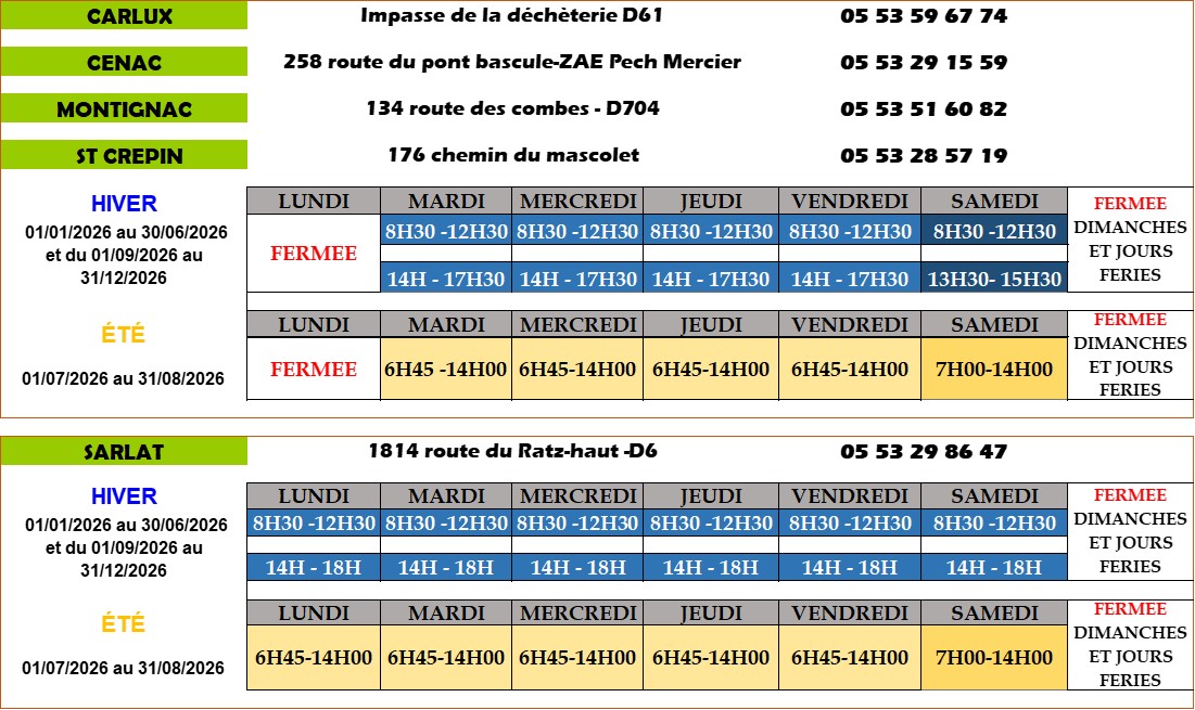 A compter du 1er janvier 2026, les déchèteries de Carlux, Cénac, Montignac et Saint Crépin-Carlucet, adopteront les mêmes horaires d’ouverture. Ceux de Sarlat restent inchangés.